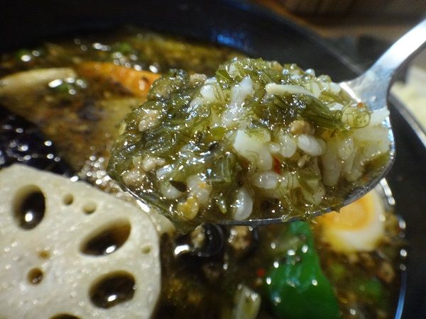 野菜の歯応え、挽肉とガゴメの舌触り。
