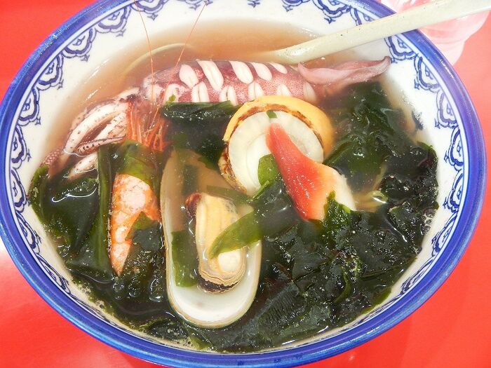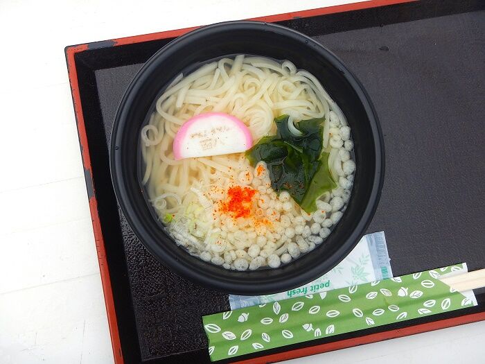具材はネギに揚げ玉、ワカメとかまぼこ