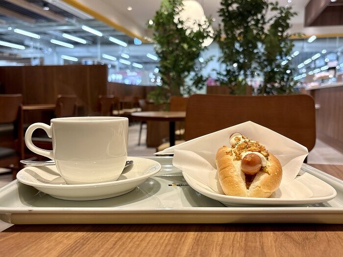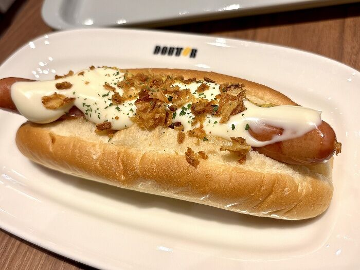 チーズソースフライドオニオンドッグとブレンドコーヒー