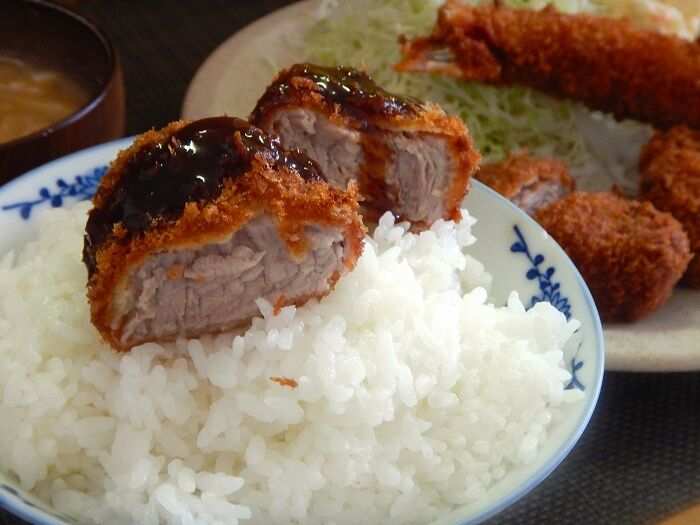とんかつ屋のヒレ・エビ盛り合わせ定食で、2up