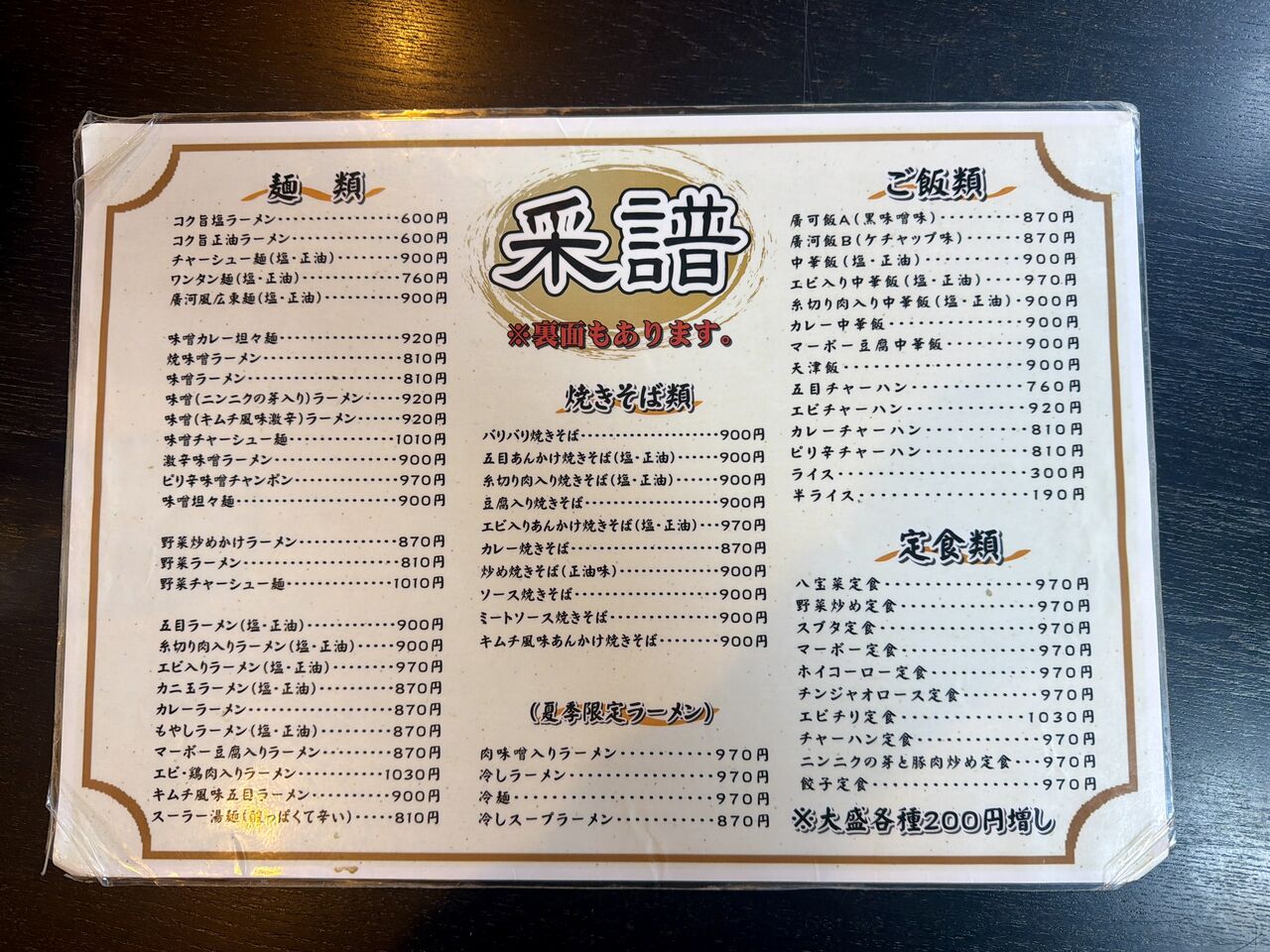 メニューの裏面と卓調