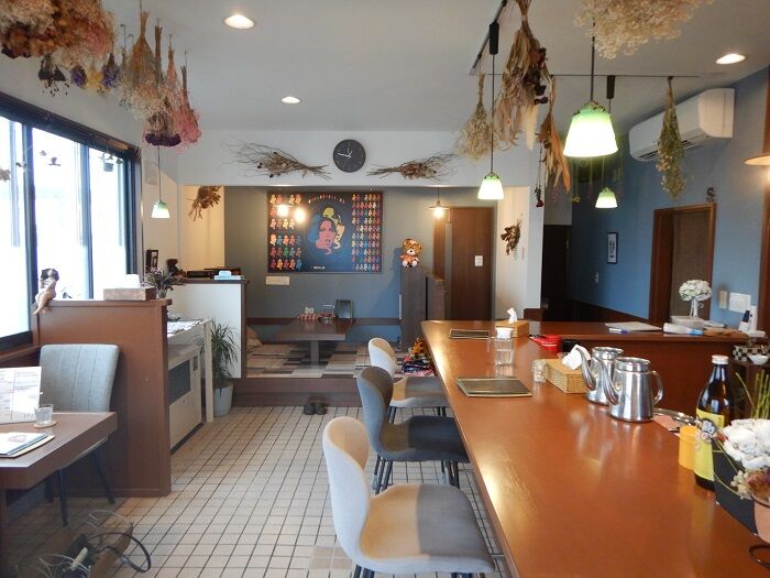 ドライフラワーが至るところに吊るしてあるし