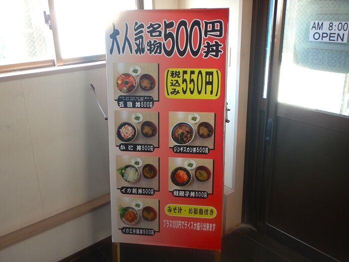 良い天気に気分もよくして、お店の前の500円丼メニュー