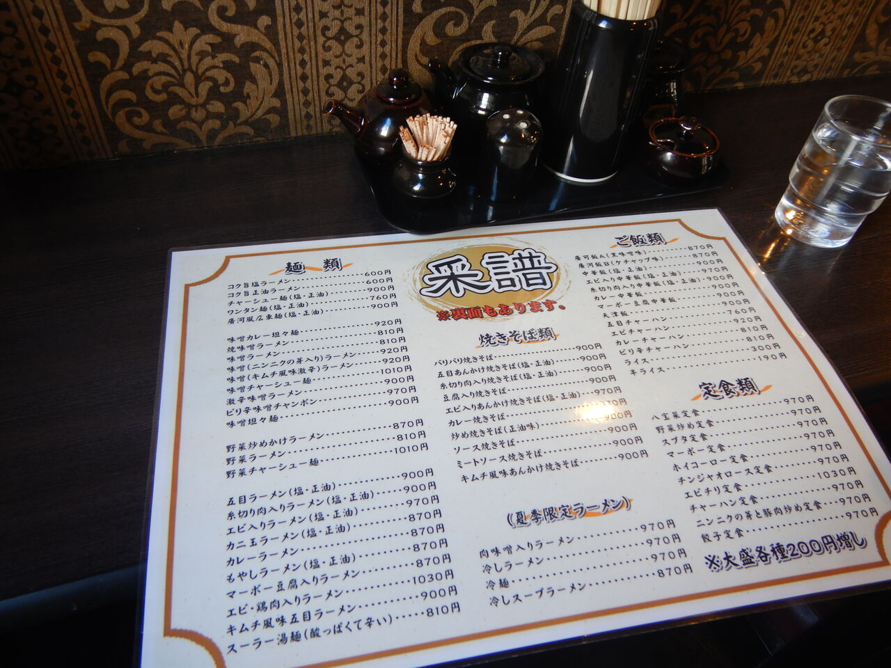 メニューの表面と卓調