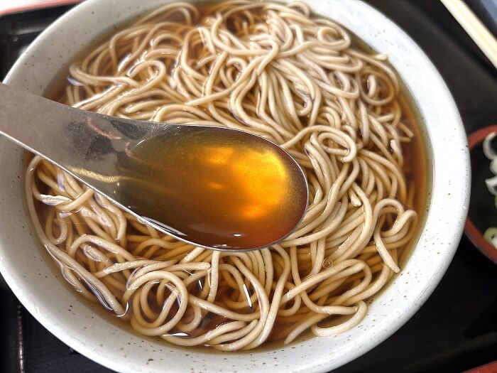 ツユの表面を覆う縦横無尽な麺線
